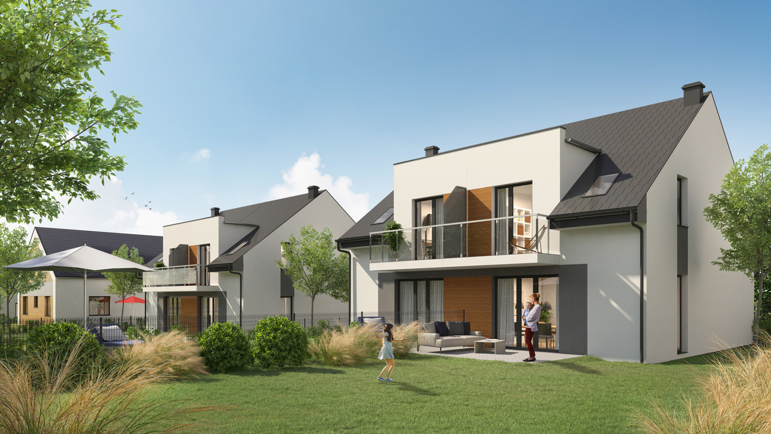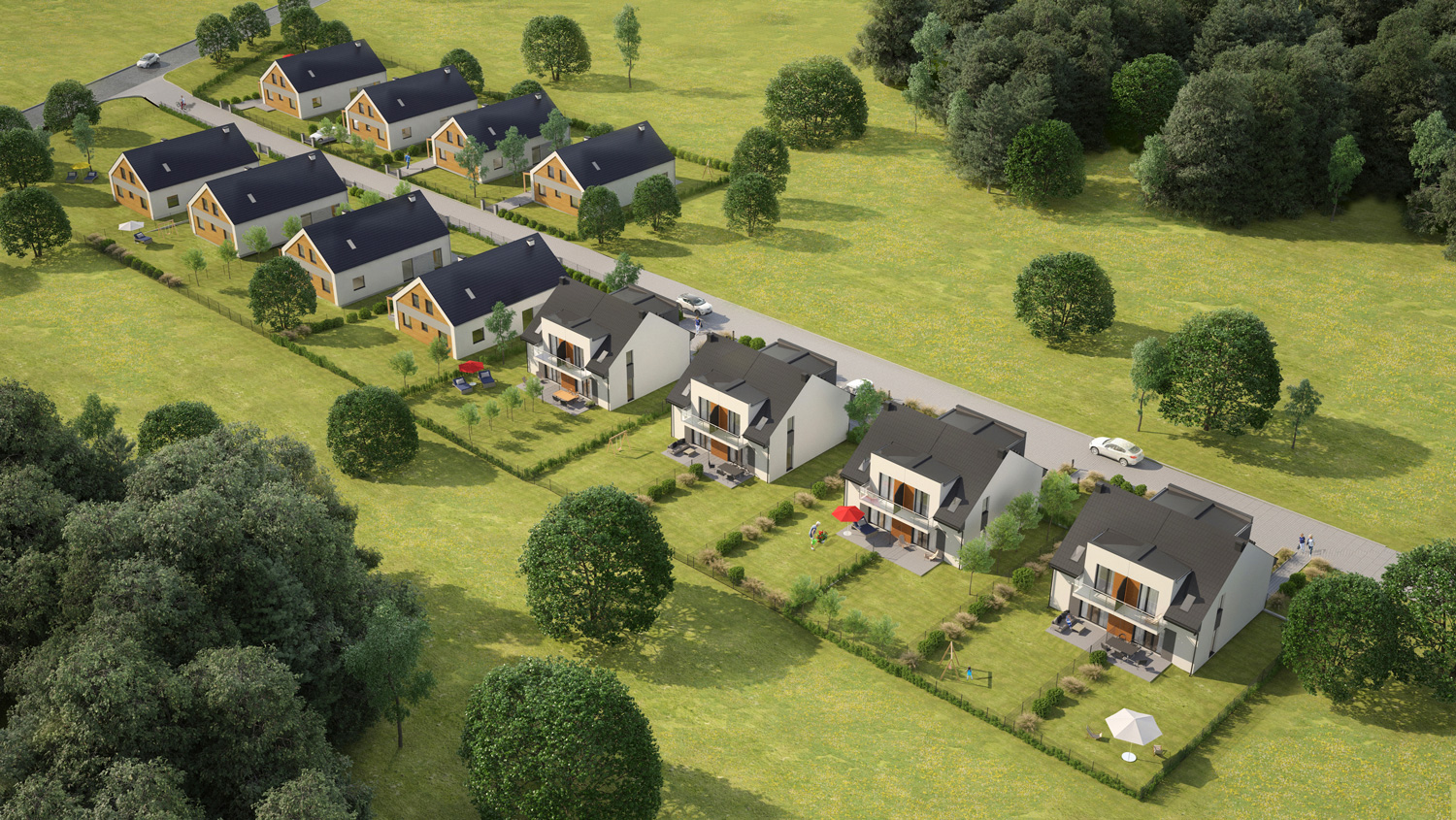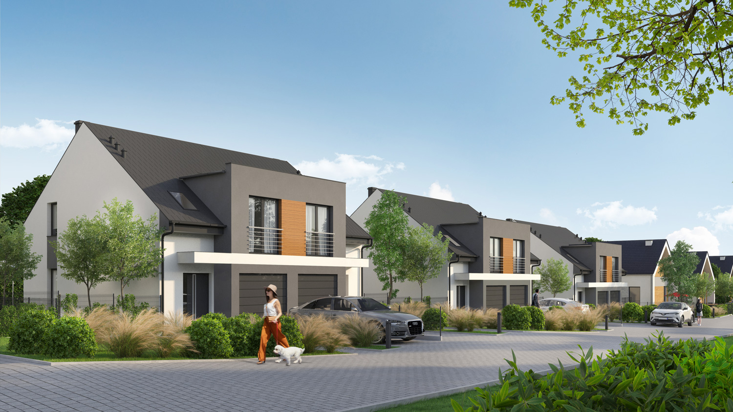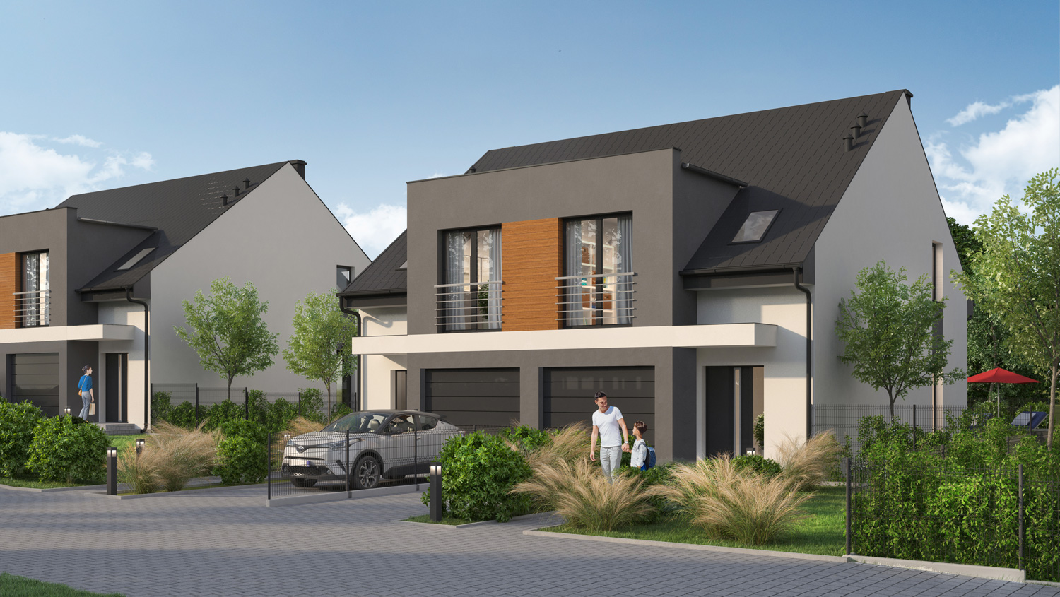 Wszystkie bliźniaki będą miały ogrodzone działki, podjazdy, wodociąg, szambo lub oczyszczalnię, światłowód, elektrykę, hydraulikę oraz instalację alarmową.